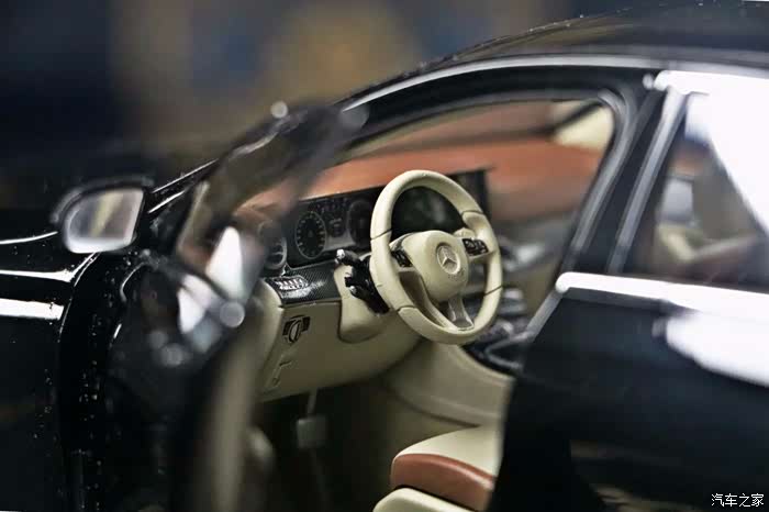 奔驰E级的内饰和其他的奔驰车型相同,车内的豪华感很强烈。来到这台E级车模内饰,必须要给它的内饰做工点一个大大的赞。车模的整体内饰采用了米色搭配,温馨感还是很赞的。方向盘细节做的很出色,多功能摁键(左、右)都有完美地刻画。