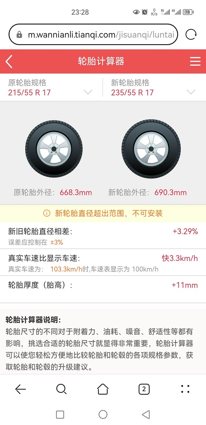 原厂胎17寸7J轮毂,原厂胎215 55R17,我知道能装225 55,看网上有些能装有些不能装到底能装235 55R17轮胎么?
