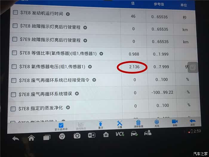 此刻已经进入了维修的白热化状态,电脑报出的故障码经过测量之后均没有发现问题所在。我进入发动机系统的数据流界面,希望从这里找到一些问题。功夫不负有心人,果然让我看不到了一些不正常的数据流。图中画圈的部分指示的是前氧传感器的数据流,电压一直在2.1V左右一直没有变化,原则上这个前氧传感器的电压是变化的,也就是说电脑不断的控制混合气浓稀之间变化,我上车加油门和收油门这个数据都任何的变化。