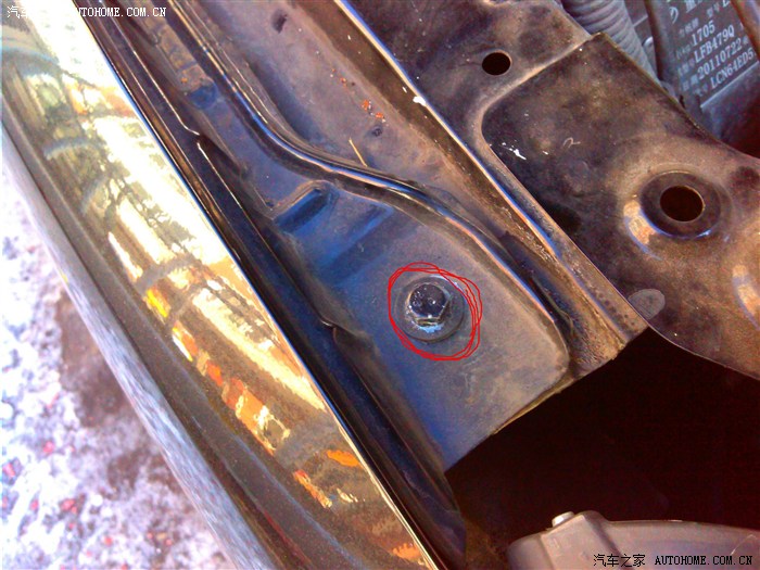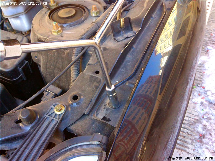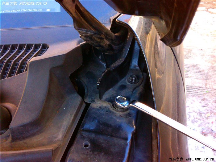然后在调两面的叶子板,这个要用桶试的10号扳手,把螺丝松开,旁边还有一个,总共两个螺丝,一看就看到了,松开之后把叶子板往里推,能推进一点,然后把螺丝拧紧。这边就好了