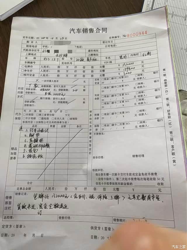 10月底的时候我又来了一次,带来家人来的,进入展厅后,看见了红旗的HS3的混动版停在大厅中,联系上次接待的销售人员,我们需要这款红旗HS3的燃油版,小县城充电桩不多,不方便充电,燃油车更方便出行。由于我想要的车没有现车需要订购,所以这次我们与销售简单地了解一下这款车型后,最终选择了24款1.5T两驱善为版,来了就把价格谈好,定好,交了订金3000元,选择的是贷款两年分期零利率还款,下次来直接提车回家啦。