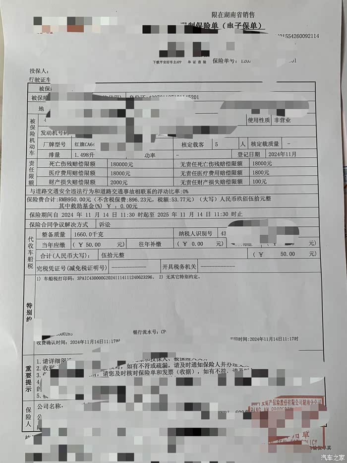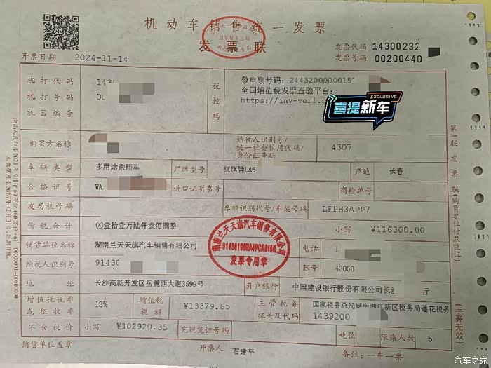 半个月后,2024年的11月14日上午我们又来到了红旗4S店里,这次是真来提车回家的。新车4S店已准备好了,见到新车的时候心里好激动啊,今天必须把手续办了,为了能今天开回去,一直在催销售人员,今天一定要把提车事情都搞完,车要开回去,好在半个月前已经把价格谈好,赶在他们下午下班前把所有的提车事情搞完了。