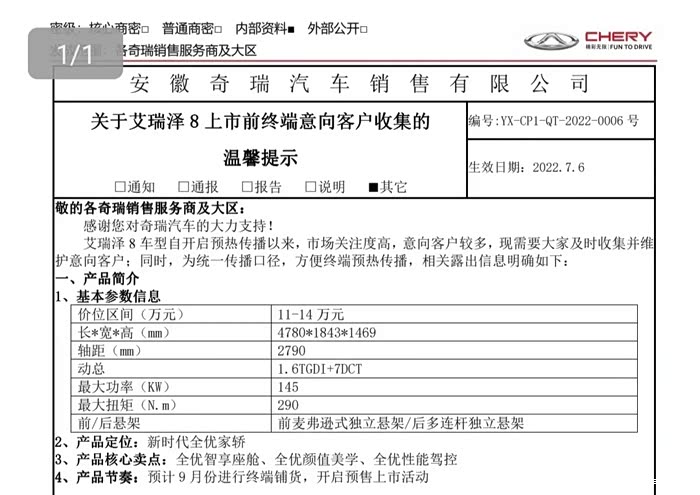 艾瑞泽8量产车基本参数信息