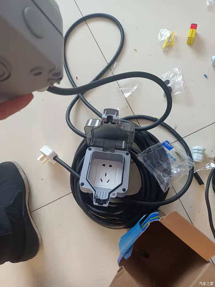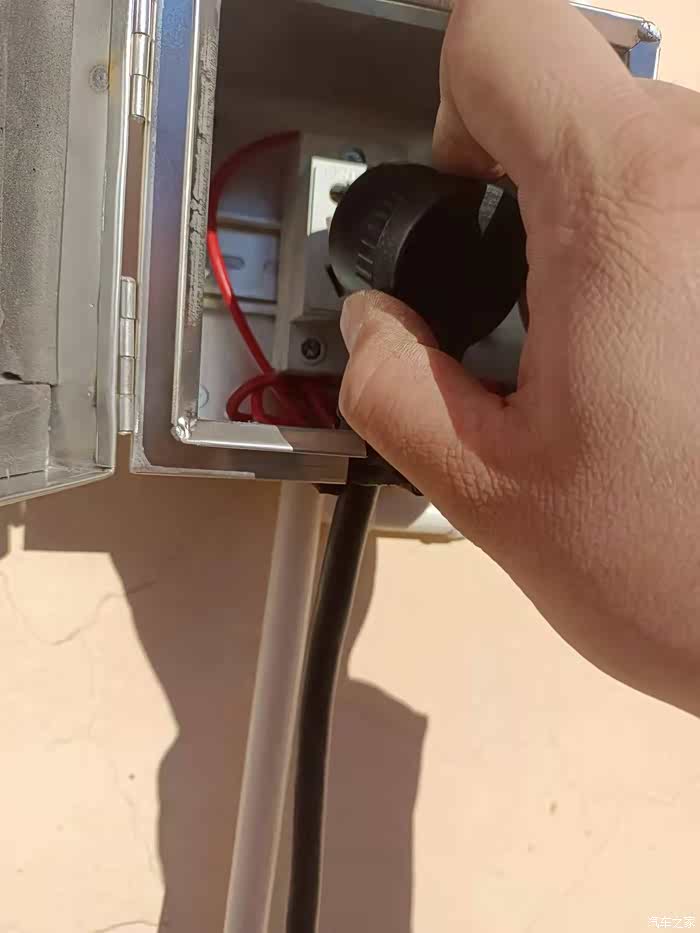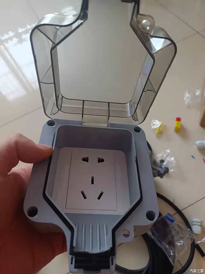 自己买的配电箱,有点太小,充电插头放不进去,用刀子削了一块。