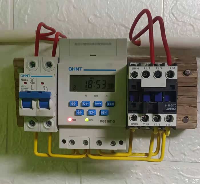 左边是空开,有过载保护,漏电保护作用。中间的是定时器,右边是交流接触器,交流接触器的作用是,如果用定时器单独控制给电车充电电流会过大,定时器无法承受会烧毁。现在是用定时器控制交流控制器,控制器控制电车充电。自己布线,还行吧!