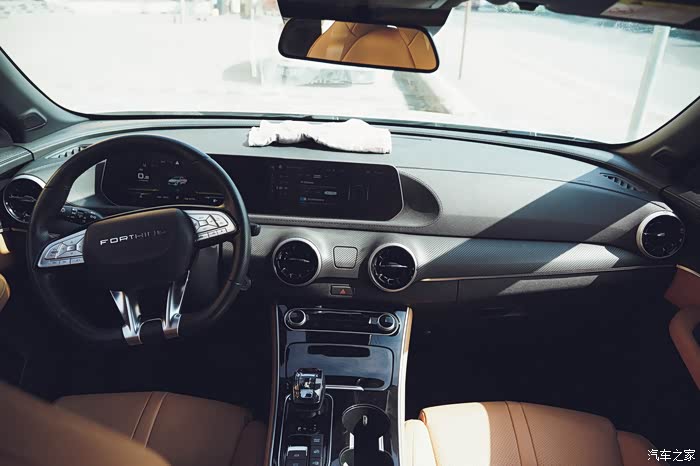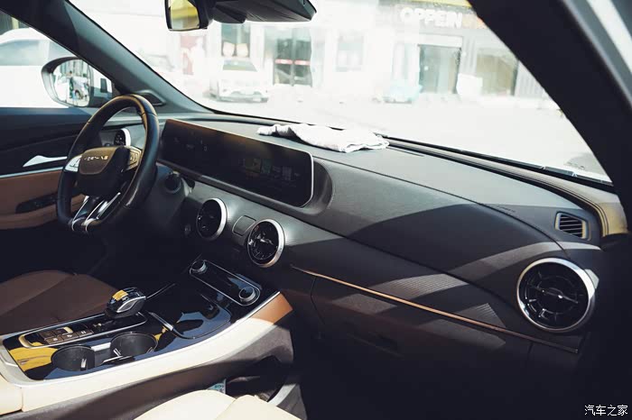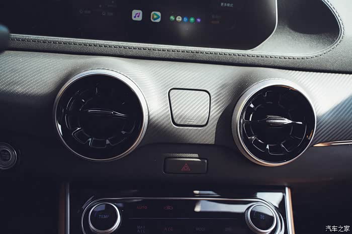 说到设计就会有点停不下来,这台车的中控我发现正对着看和从侧面去看也是不一样的感觉,正对着就是极简风格很明显,侧面去看的话就会发现,科技感真的很强,而且还略带一点美式豪华的感觉,复古风设计,有点进口林肯的那种既视感,线条也是特别的丝滑,用料做工质感也够。