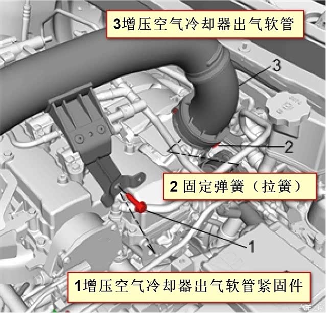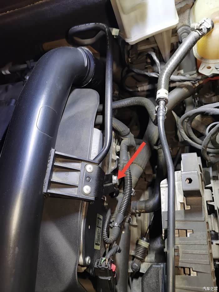 4.先松开发动机右边红色箭头有个固定管道的螺丝,M10扳手或者套筒就好了。松开拔出螺丝,找地方放好。