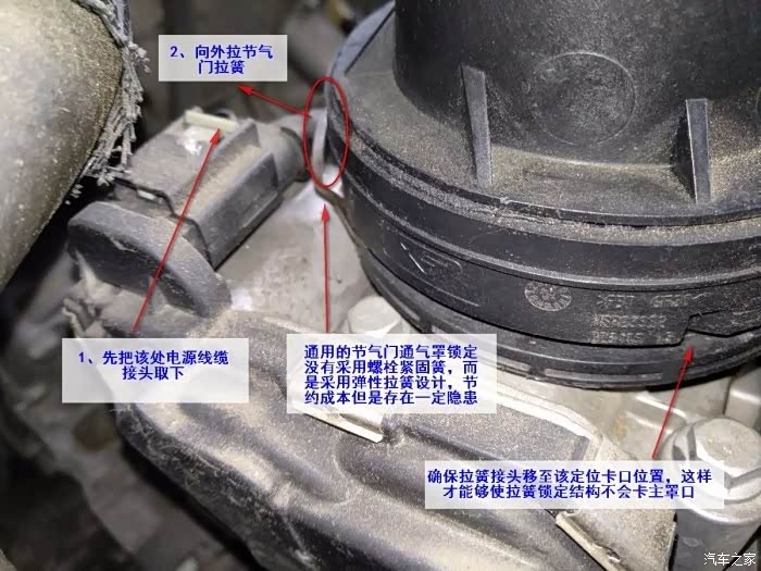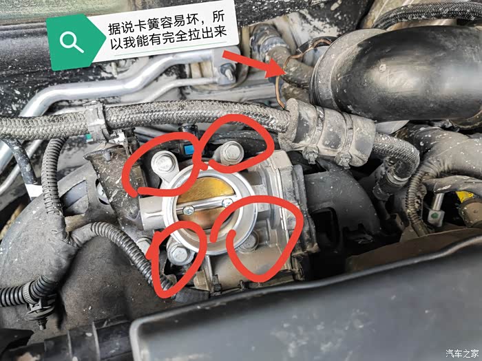 6.拉开卡簧,稍微晃动下进气管就可以把进气管从节气阀上拔下来了。之后节气阀的真面目就露出来了。