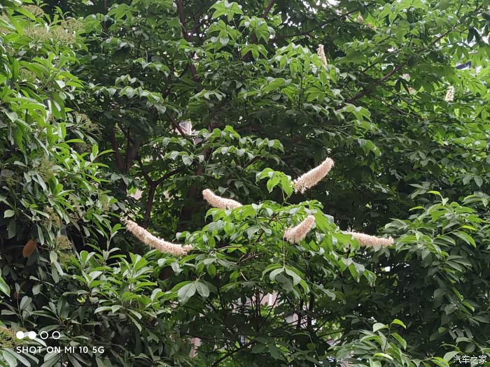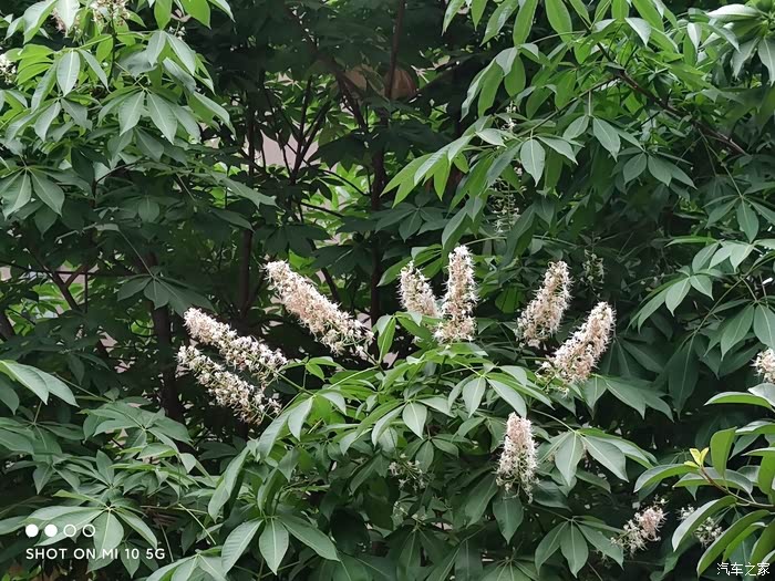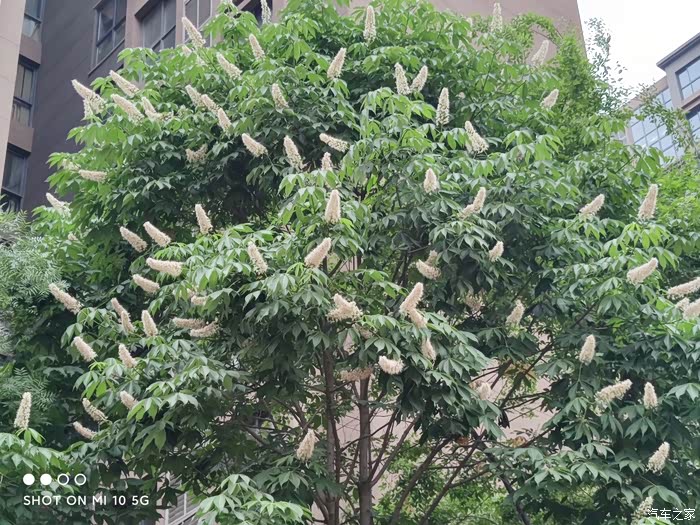 出门就看见这样一株树,枝头开满了串串花,上网搜了一下,原来叫七叶树。七叶树树形挺拔,花朵又大又美,而且叶片有一定的生长规律,不疏不密,看起来十分美观。