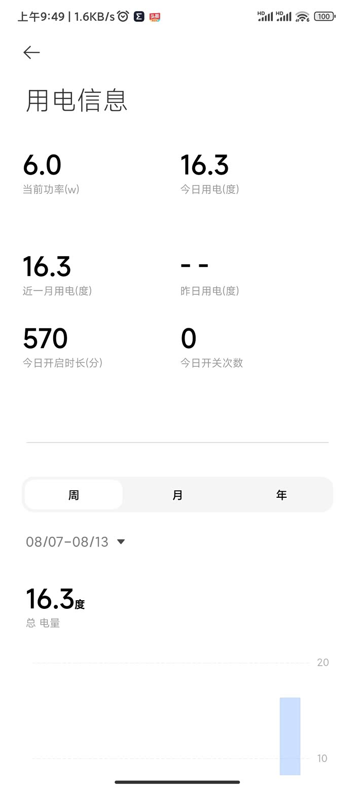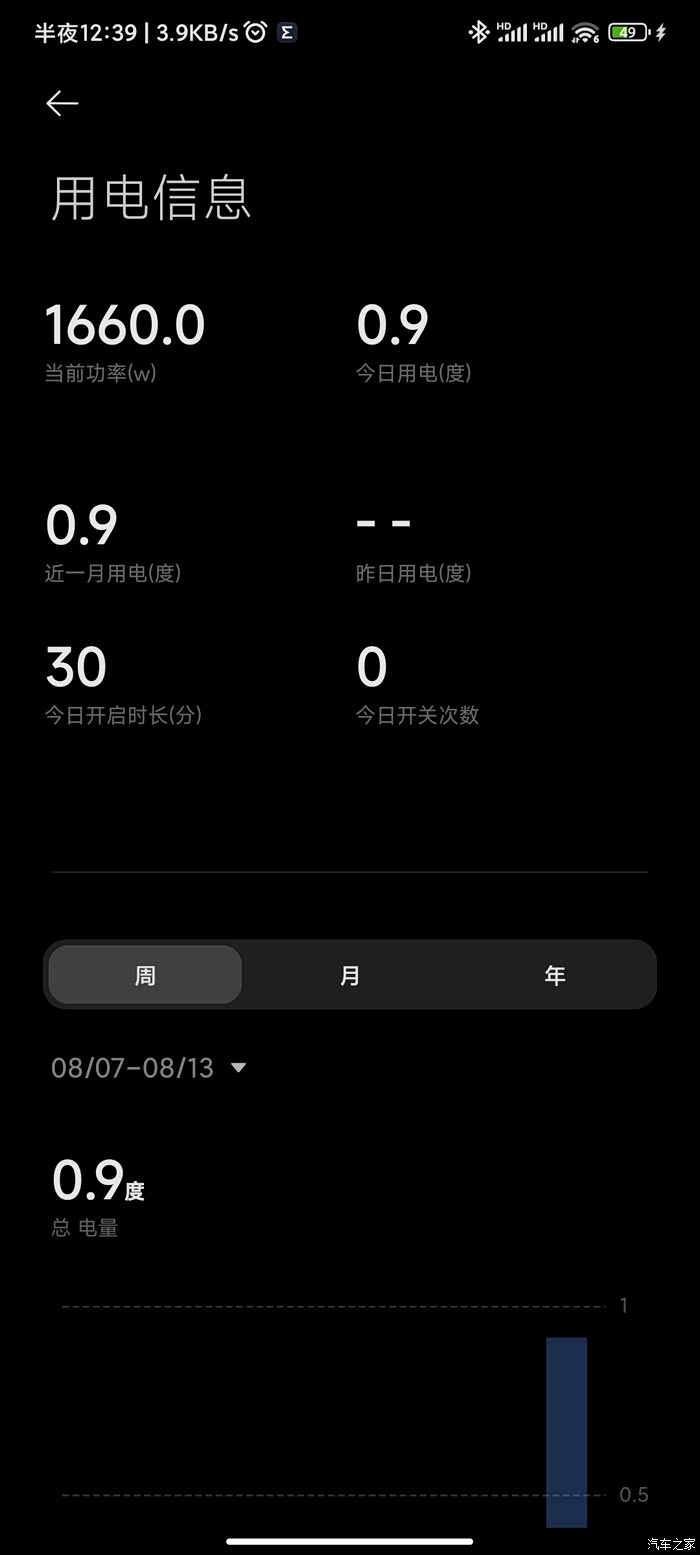 1.周六晚24时开始慢充,充电时车辆剩余电量 13%,充电功率1660W,中途观察几次,充电功率最高1667W。截止周日9:49发现充电结束(实际充满时间未知), 无充电时功率6,共充电16.3度。
