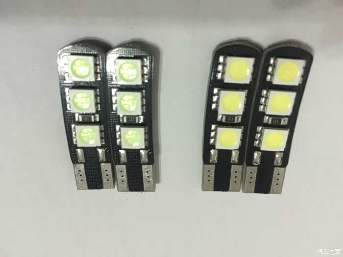 T10 LED 小灯,功率不大,这种是5050芯片,发热量经过4小时测试的确不小(当然不是在车上测试,找了个12V直流电源测试的),但可以接受;图中黄色芯片的是白光,颜色稍浅一点是冰蓝(闷骚蓝),我承认我骚不起来,最后用白色了!