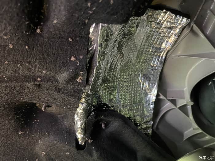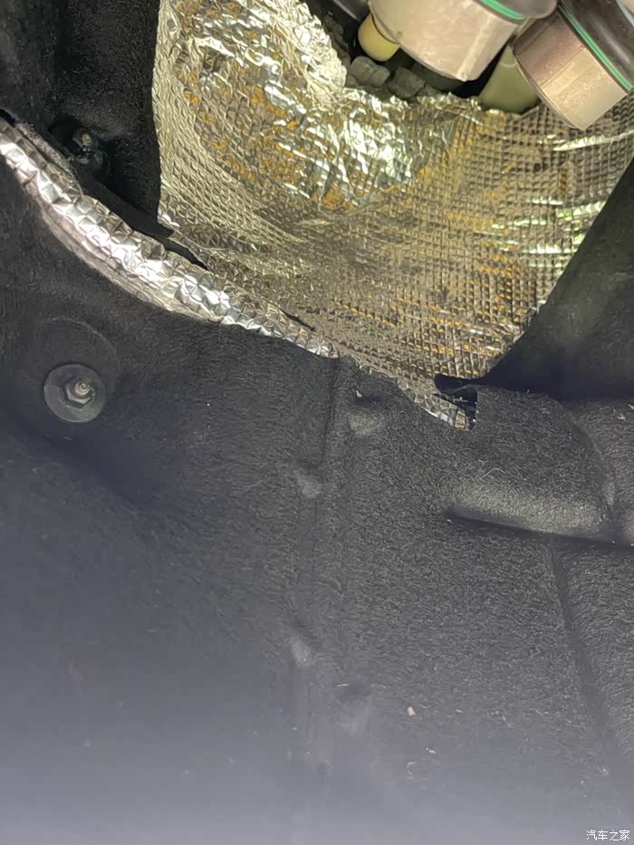 这个铝箔位置就是进泥沙的地方,是一个不规则的大长条漏洞,车轮上有泥水的话,跑起来会甩进去,这个应该是属于设计问题,理论上如果把这个内衬板设计成凸型把上面的车梁包进去,把这一块地方多覆盖点就不会有泥沙进去了;