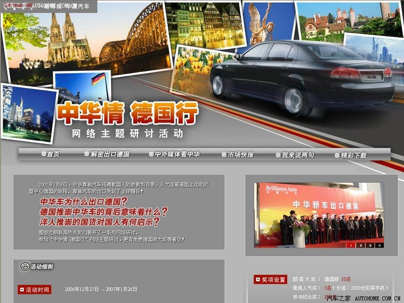 这是怎么回事呢?大家先别急,请听我慢慢道来。。。 2007年1月6日,中华尊驰汽车满载着国人的骄傲和自豪,从大连离港踏上远赴欧盟中心德国的旅程。尊驰轿车的出口受到了全球瞩目!中华车为什么出口德国?德国推崇中华车的背后意味着什么?国货风行欧洲高端市场对国人有何启示? 围绕近期新闻热点华晨汽车展开一系列网络研讨。其中有一个“中华情 德国行”网络主题研讨!(见下图)