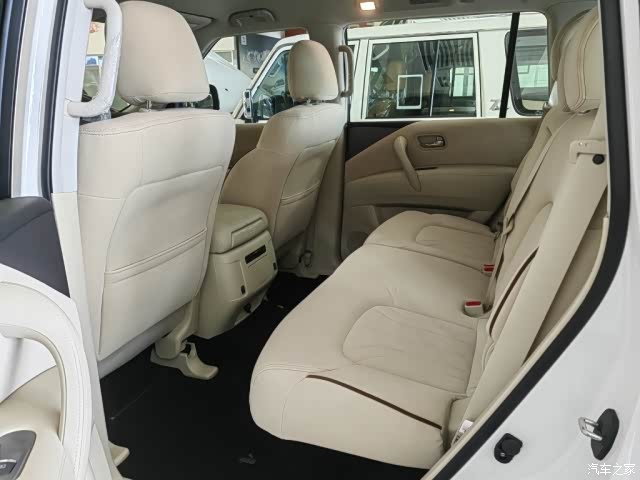 日产尼桑途乐乘坐空间十分充裕,前排横向空间和纵向空间都非常充裕,座椅宽大厚实,低配采用织物材质,高配车型为真皮包裹,途乐Y62给中间座位同样配有头枕头,并在扶手箱内设有两个杯架。前排支持腰部支撑调节,新车第二排空间相当充裕,此外还可以放倒,Y62全系中央扶手箱设有冰箱功能,夏季在也不用担心没有冷饮了。