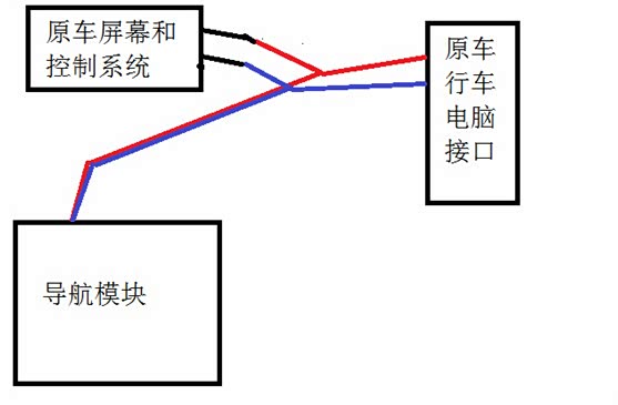 新增加的导航模块和原车的行车电脑部分系统是并联关系。就是把原来接到行车电脑的电源线和LVDS线,从行车电脑拔下来,插到导航模块自带的线上,然后把导航模块自带的线插到行车电脑上。