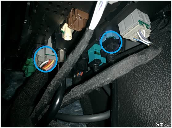趴下看行车电脑,把蓝色圈位置的两个插头拔下来