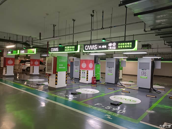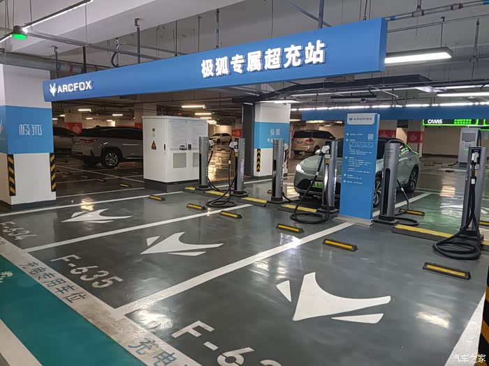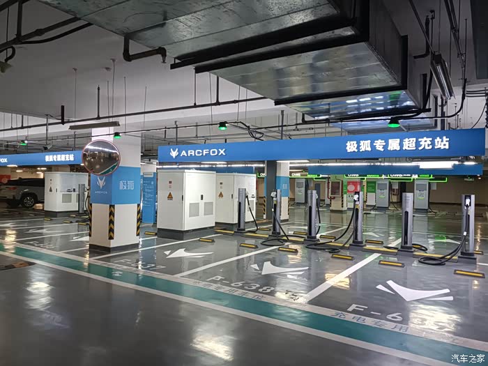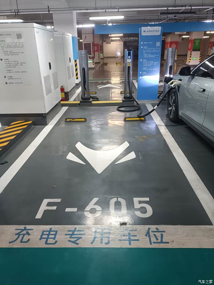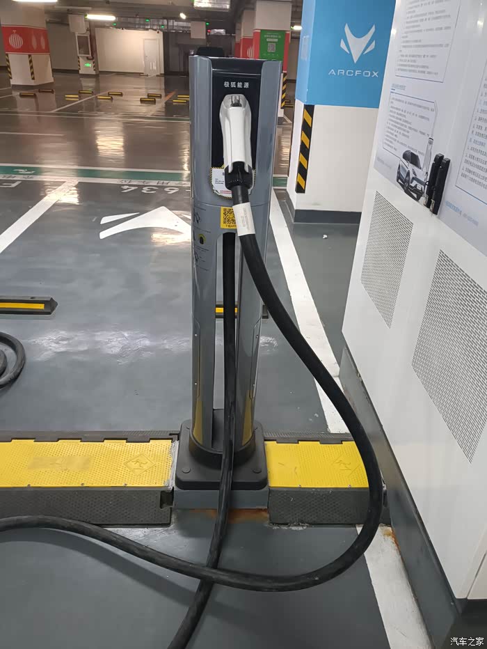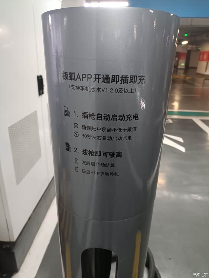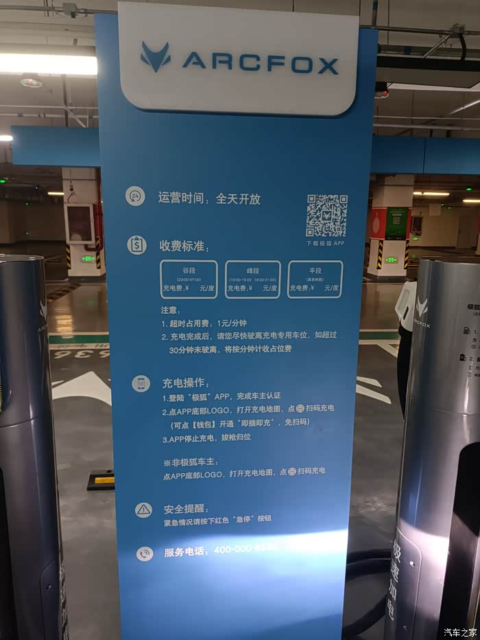 这次的位置是综合写字楼的地下停车场,在地下三层。进了车库不要怕找不到充电桩,在必经之路和拐弯处都适时的贴上了指示标识和方位,这个很贴心,转了几圈之后就看到了极狐专属充电桩,熟悉的蓝白配色很是显眼。对向8个车位也喷涂上了极狐专属logo,满满的归属感,对比对面大众的充电桩显得很简约,还是熟悉的即插即充,没有繁琐的操作,插上充电枪坐车里看剧听歌就可以了。唯一不足就是这的电费没有峰谷平,统一价格1.57元/度,不变的是充电速度,一部电视剧的时间就充满了,充电还是减免2个小时的停车费。大家快去体验吧!