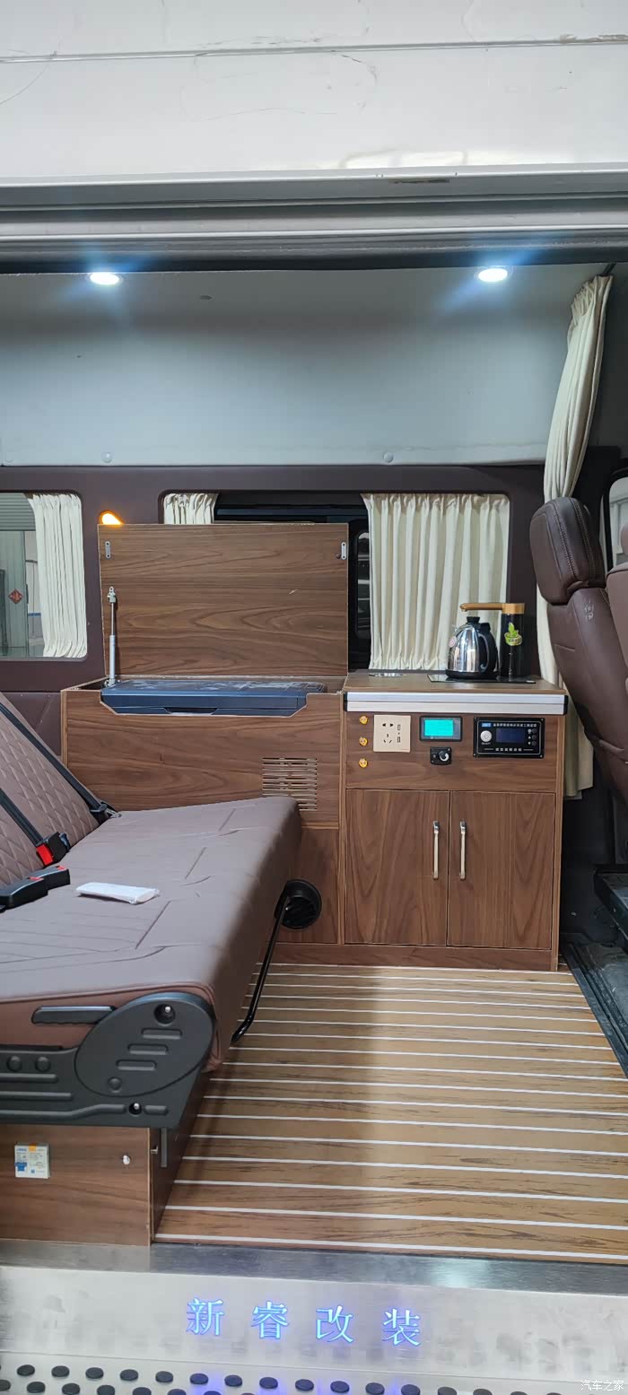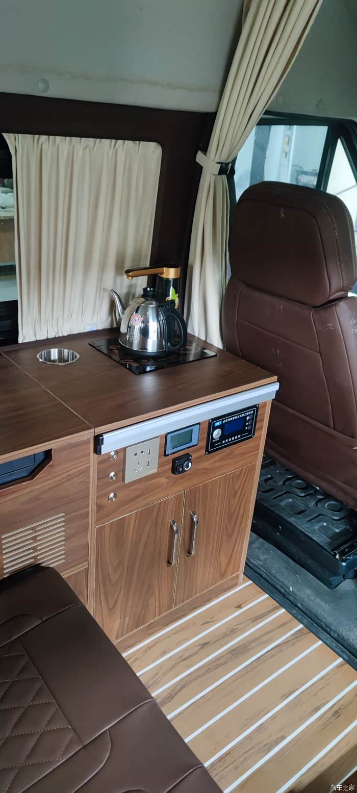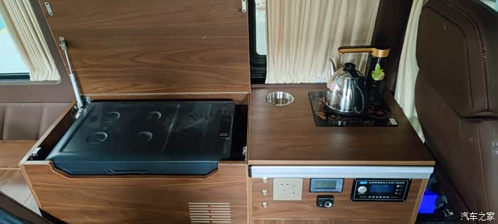 在中排卡座左边做了一组边柜,一个30升的压缩机冰箱出游放食材很方便,台面放了一个自动上水的烧水壶,金灶的,大牌子用的放心。220V电源操作面板直接放在面上,库仑计,驻车暖风,灯的开关都在这里。