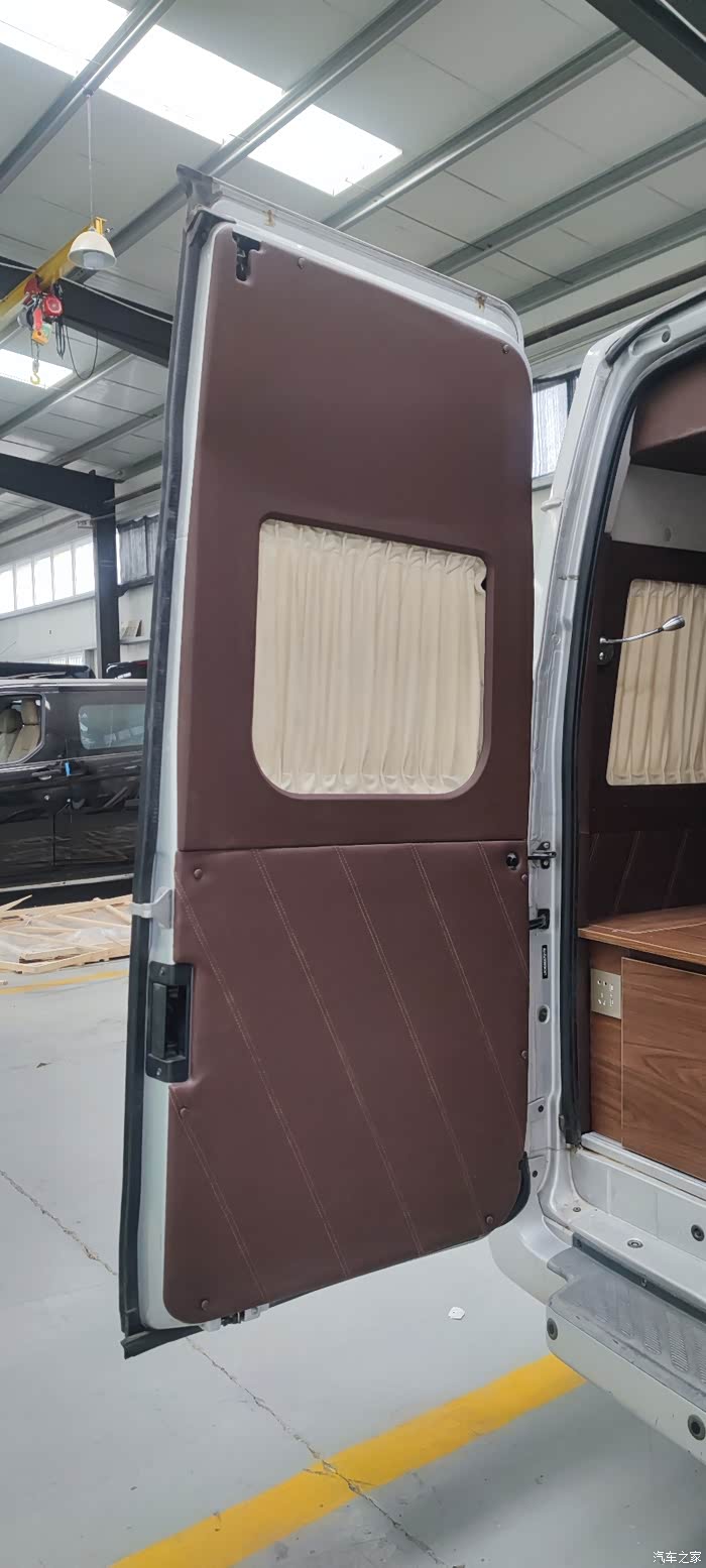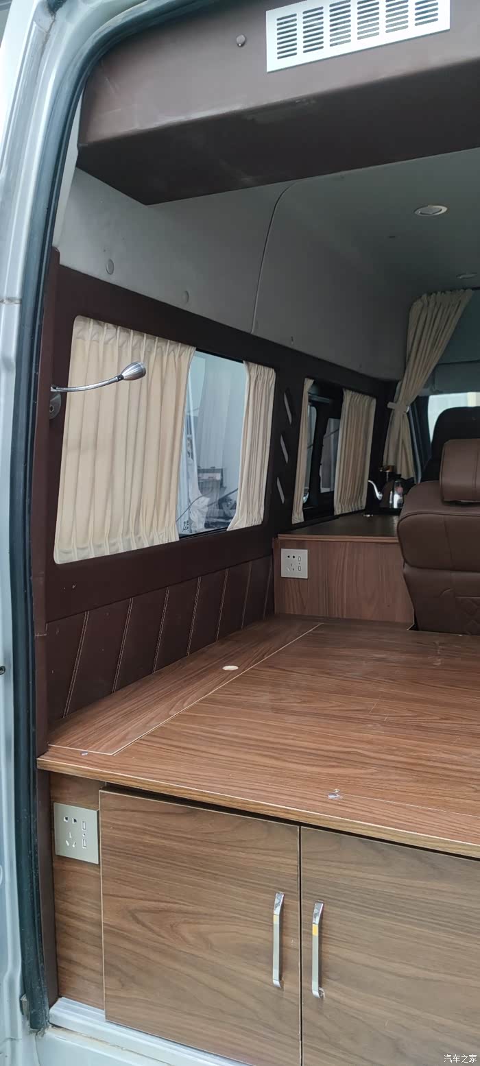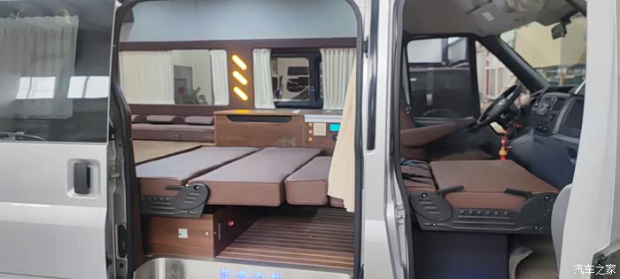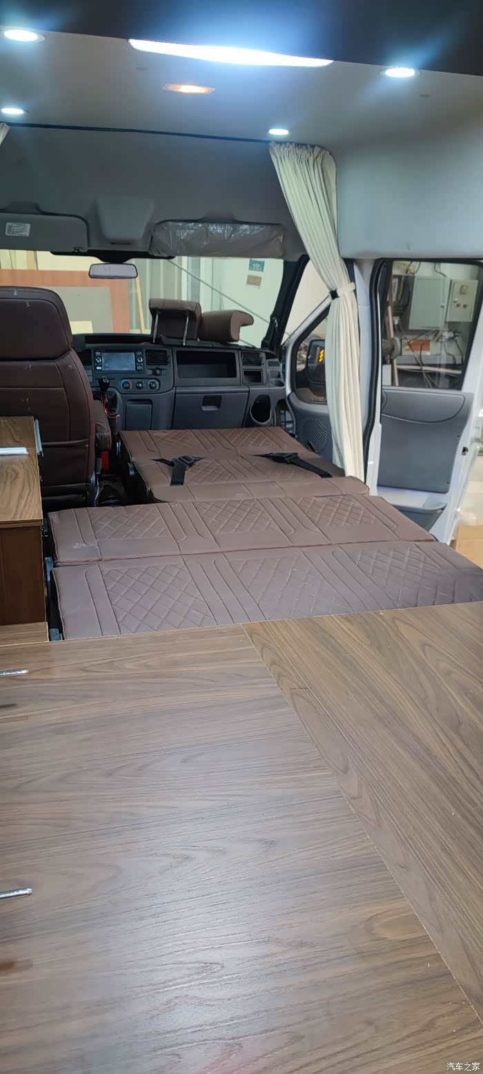 我这是6座的,后边做了一个横床,尺寸是1750?1200的大床,两侧做的窗口造型?软包,全车做了止震隔音。
