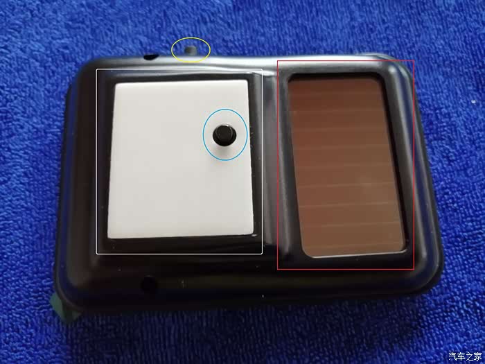白框-为沾粘胶、篮圈-为防拆导杆、黄圈-为蓝牙按钮、红框-为太阳能充电板。放心提示:未激活之前你怎么触碰“防拆导杆”都没事滴