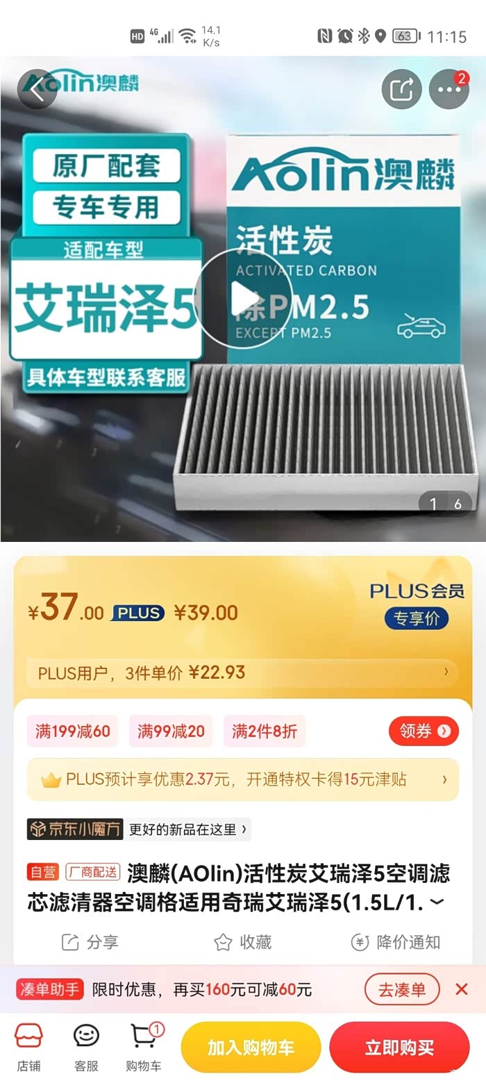 车型是艾瑞泽5plus,原厂的空滤五六十,马乐博世普通的四十多,这个活性炭pm2.5的活动22!
