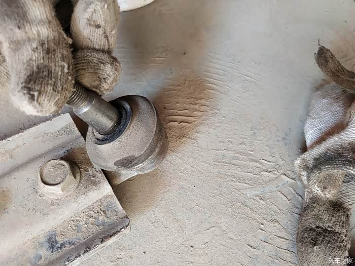 球头很不好拿下来 这里的螺栓有个梢头,卡在外套上 ,上面间隙特别小, 不好下垂子 。慢慢用锤子敲击外套,慢慢把它震下来。
