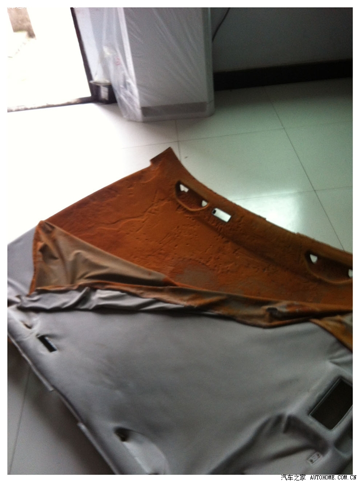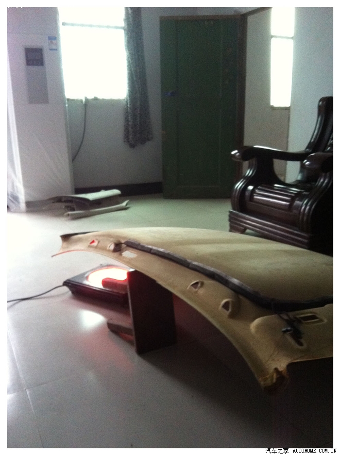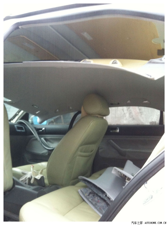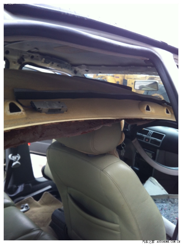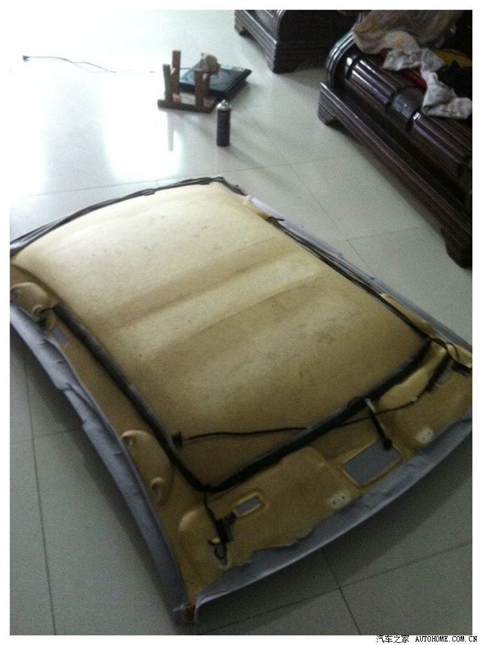 撕掉原车顶棚布。出现深黄色的东西,那是原厂有一层海棉之类的东西,为的是增加手感