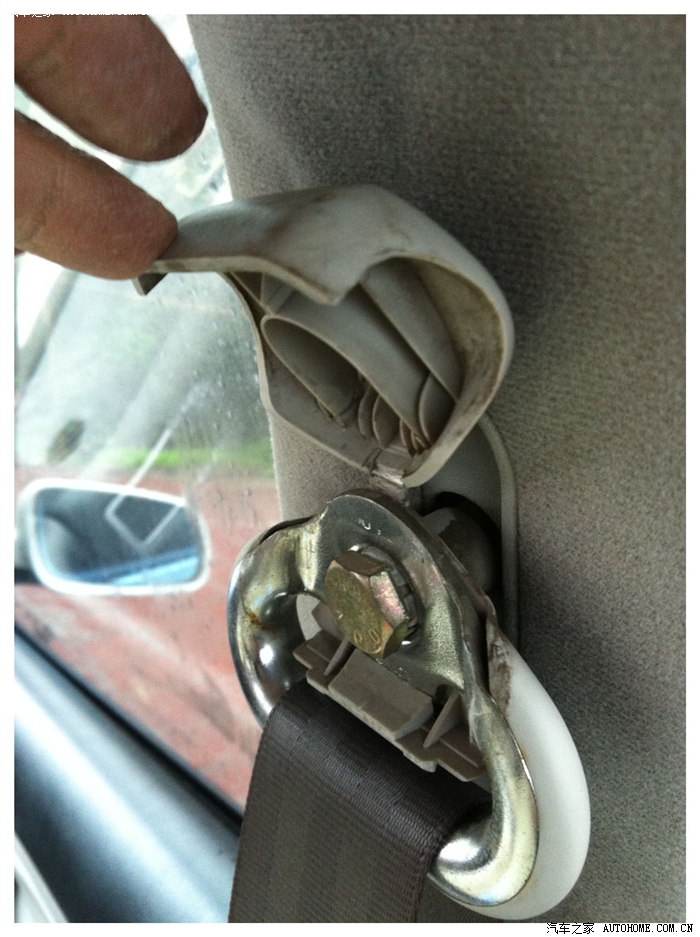 五,拆安全带,只能撬下边,上边是连着的,撬开之后用17班手拧下螺丝拆除安全带。