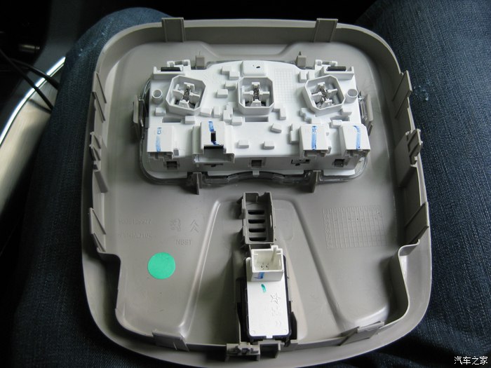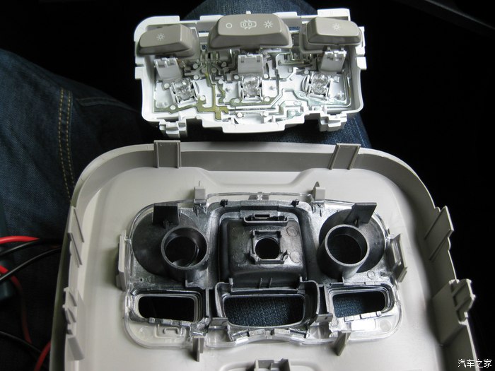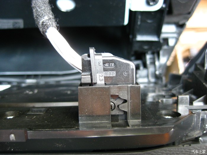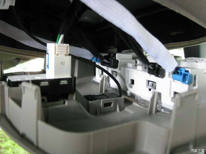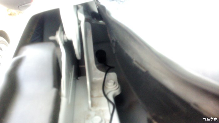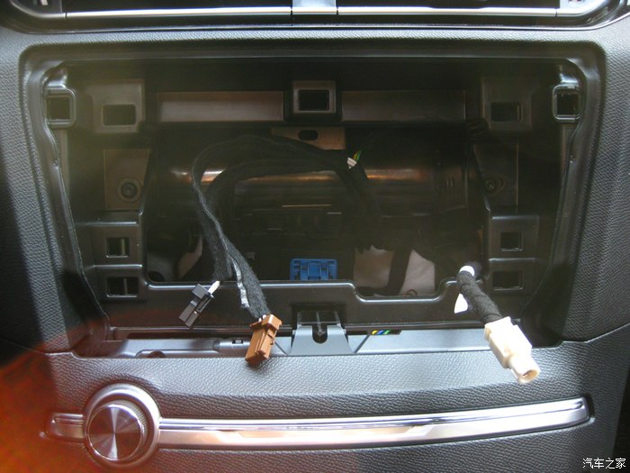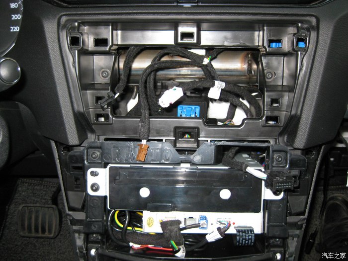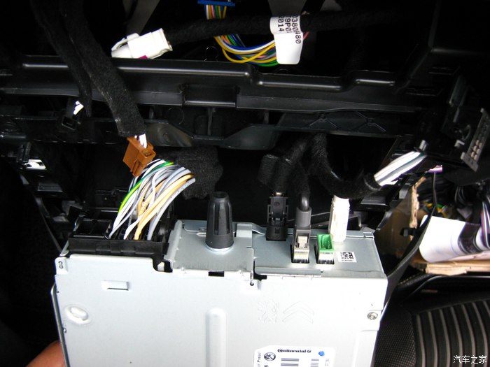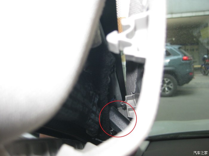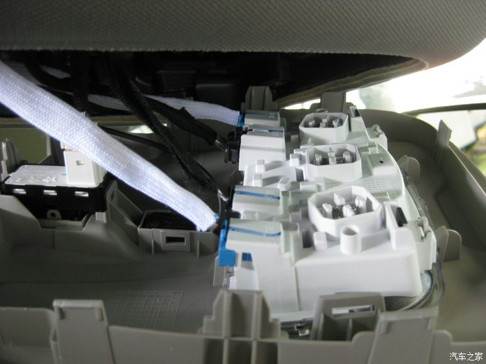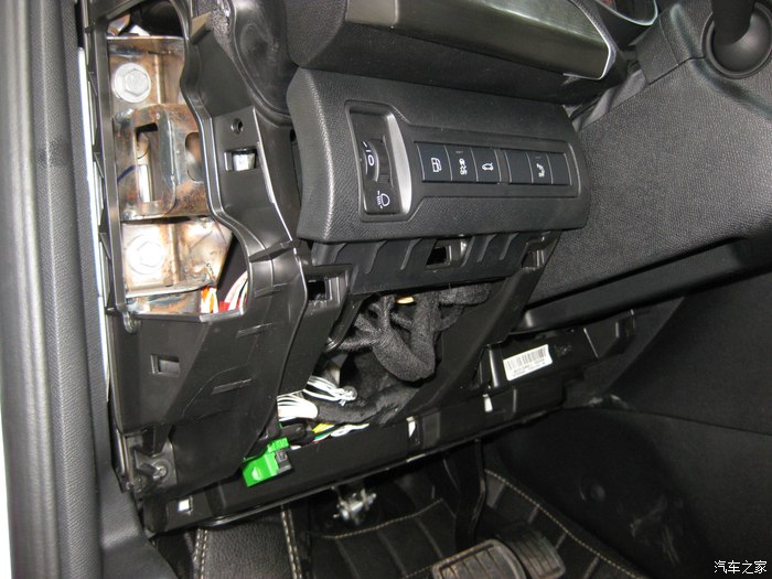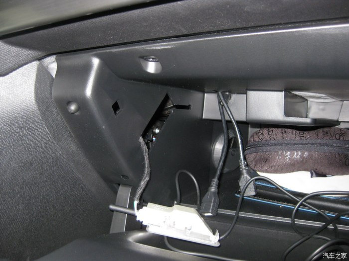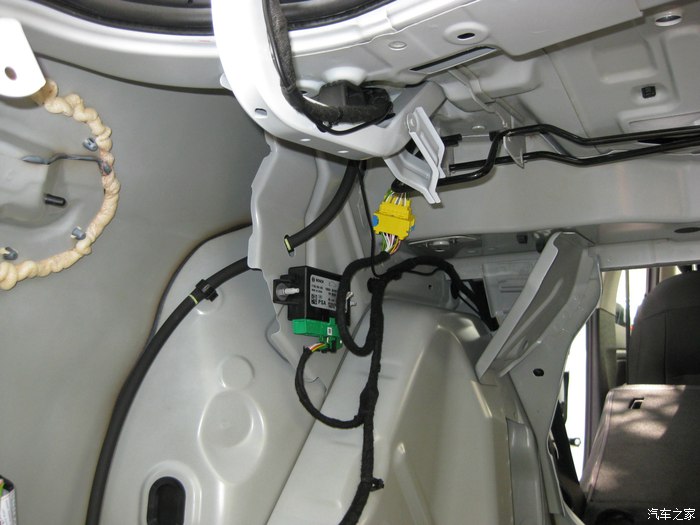 前视连线的插头正从手套箱位置穿出来,到达机舱,红色圈里就是插头。黑色的孔是天窗落水管走的孔,落水管已经拔了,穿完这个再复原。