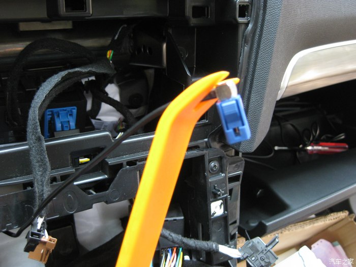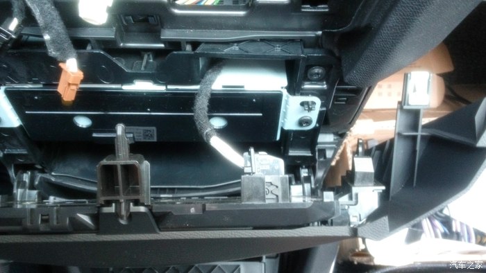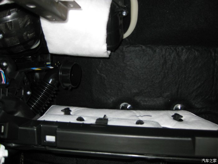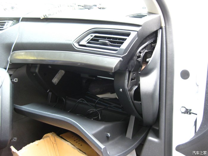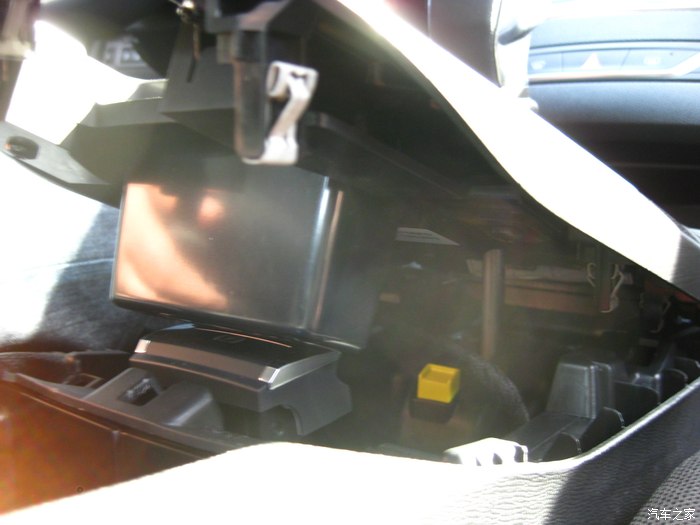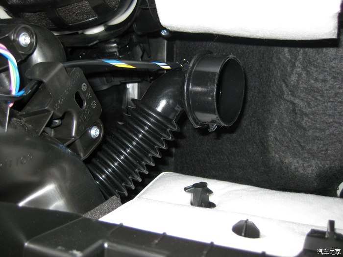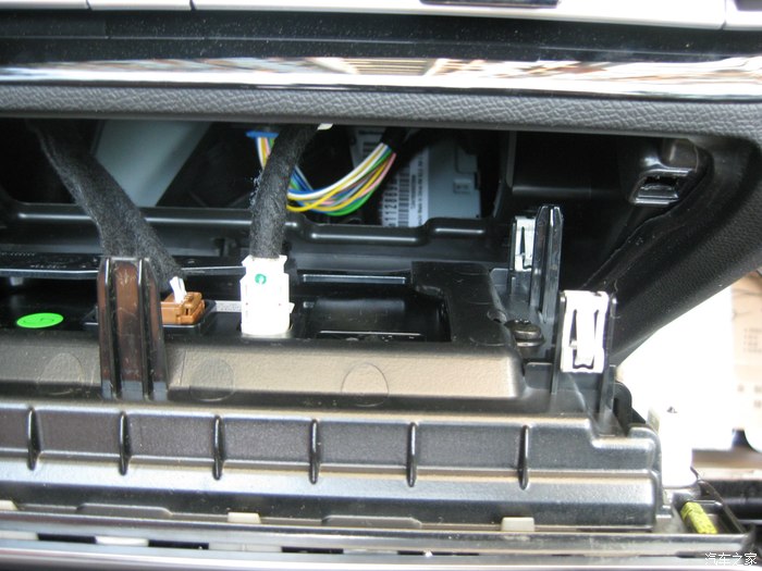 取下手套箱后的副驾驶位置。取的时候注意图中那个冷气管,有卡扣,取的时候要注意方向。