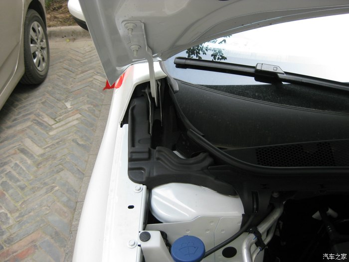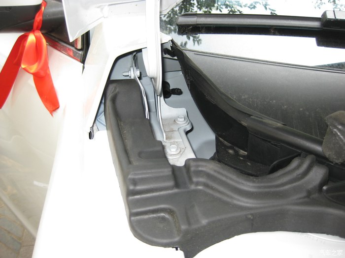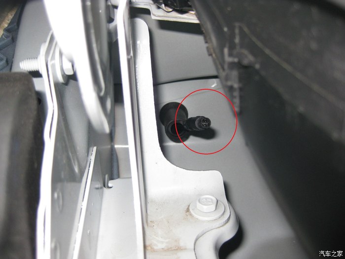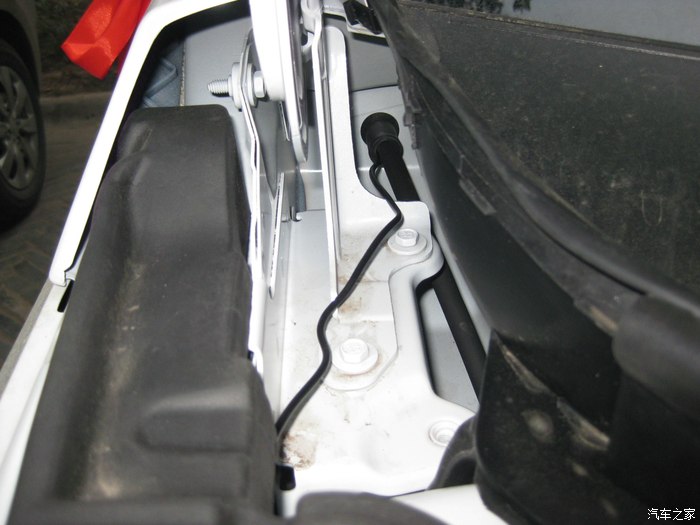 打开引擎盖左边铰链处。图中已经拿掉海绵块了。