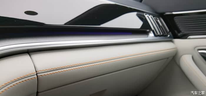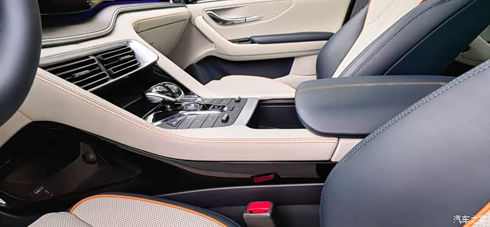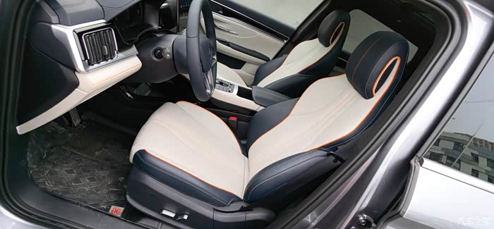 中央通道两侧都有皮革包裹,橘色的缝线显得很精致;座椅是打孔真皮,前排座椅还有通风加热。