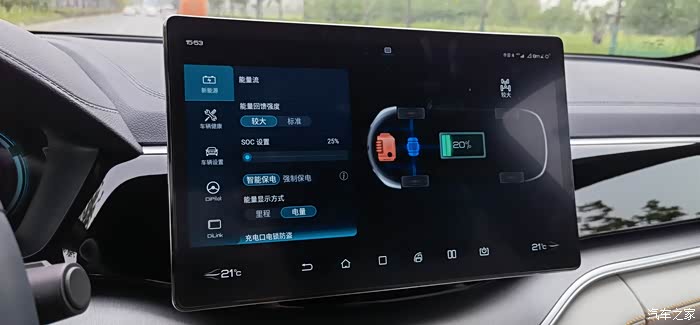 将能量回馈强度调整至最大,SOC已经是最低的25%了。新的DiLink 3.0系统的能量流图示动画很直观。