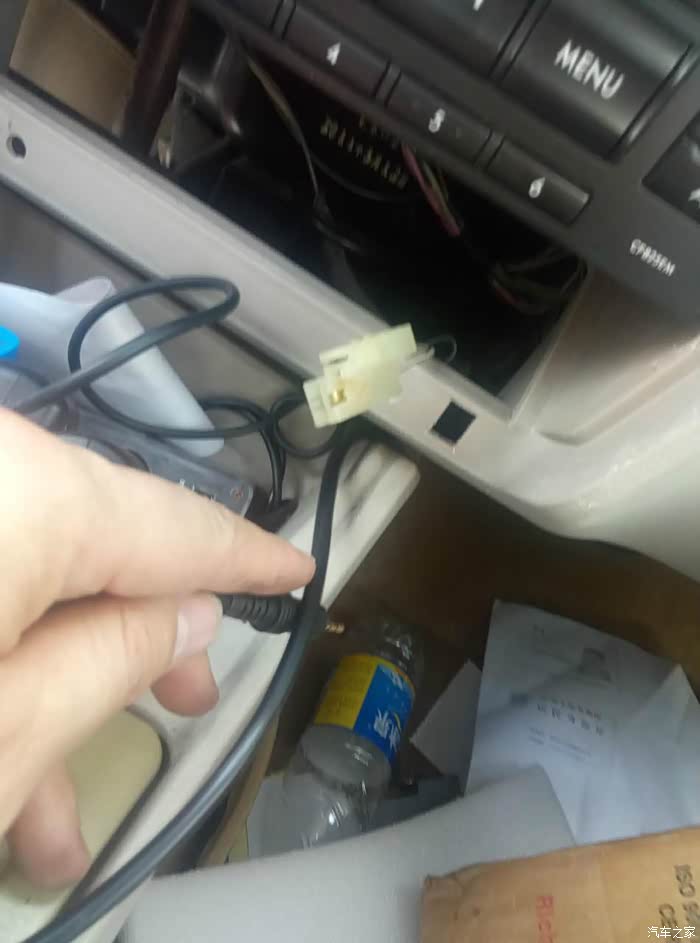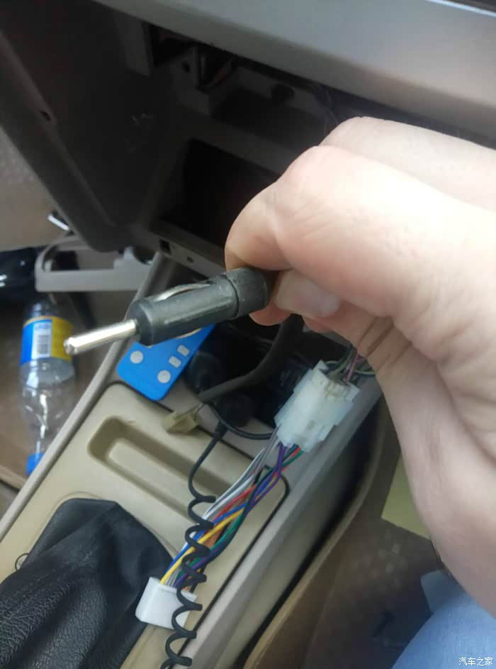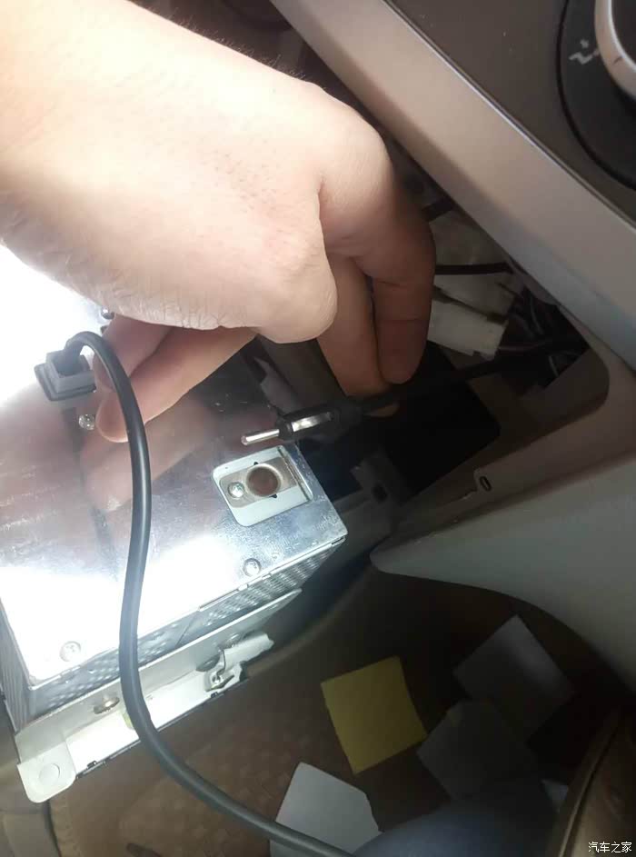 从威志车的右下方的副驾驶的脚丫子上方伸出来,卡在点烟器的下面的面板之间的缝隙处。 走线完毕。