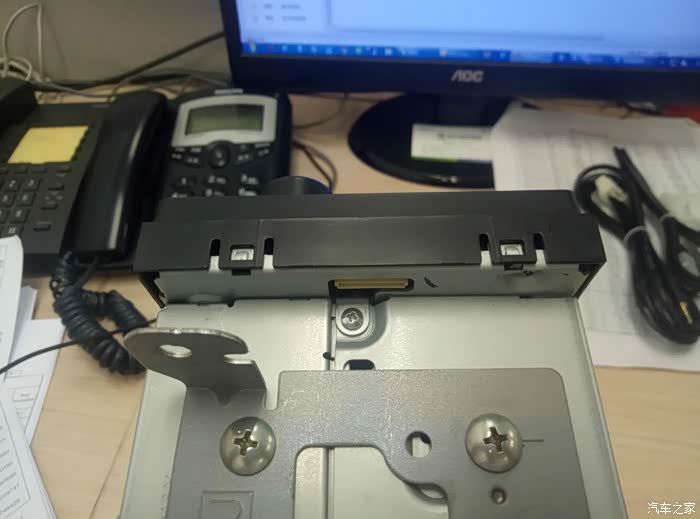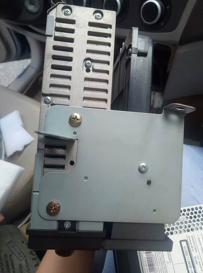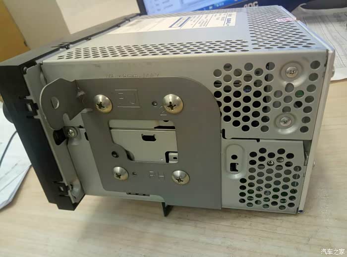 这是威志原装CD机(其实我的没有播放CD的功能),侧面3个螺丝链接。可见CD机的一个侧面还有散热片。还挺良心。左侧黑色的是车载杯架。