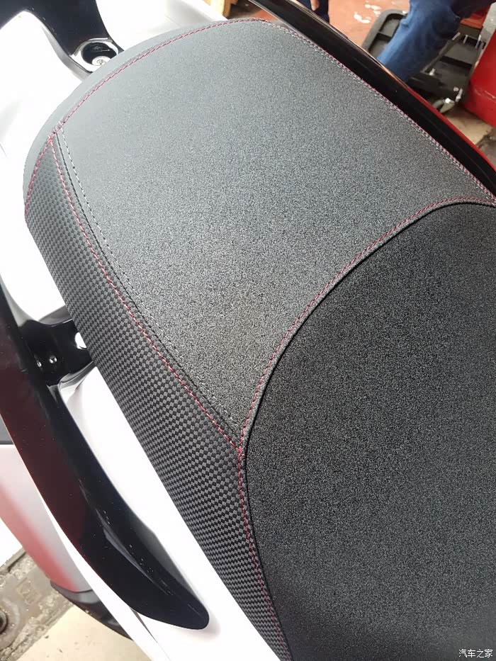 坐垫软硬适中,红色缝线+防碳纤维皮革很显运动