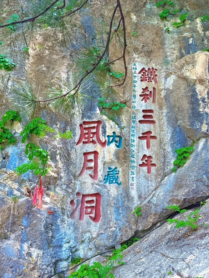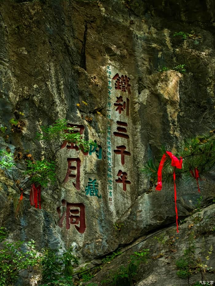 9点10分正式开始登山。上汽奥迪Q6的后备箱早已备好登山杖和便携背包,装上两瓶矿泉水和能量棒,轻装上阵。前半段是规整的石阶路,两侧古松参天,阳光透过枝叶洒下斑驳光影。行至“天桥”处,一块巨石横跨两山之间,下方是深达数十米的沟壑,胆小者需扶栏而过。继续向上,途经“云光洞”,这是铁刹山最著名的道教洞穴,洞口刻有“云光洞”三字,洞内供奉着道教诸神,岩壁上的石刻虽历经岁月却依然清晰,相传这里是长眉李大仙修道成真之处,洞外平台可俯瞰山下村落,梯田与河流交织成画。