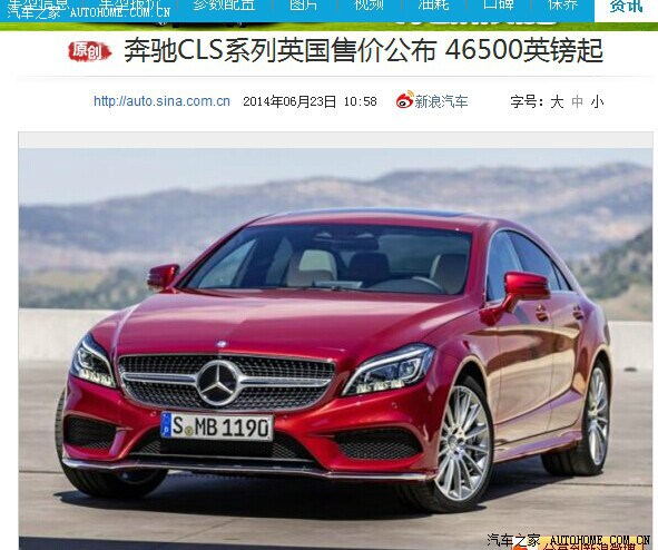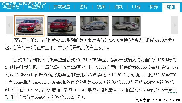 奔驰于日前公布了其新款CLS系列的英国市场售价为46500英镑(折合人民币约49.3万元)起,新车将于7月正式上市,并从9月开始交付车主使用。