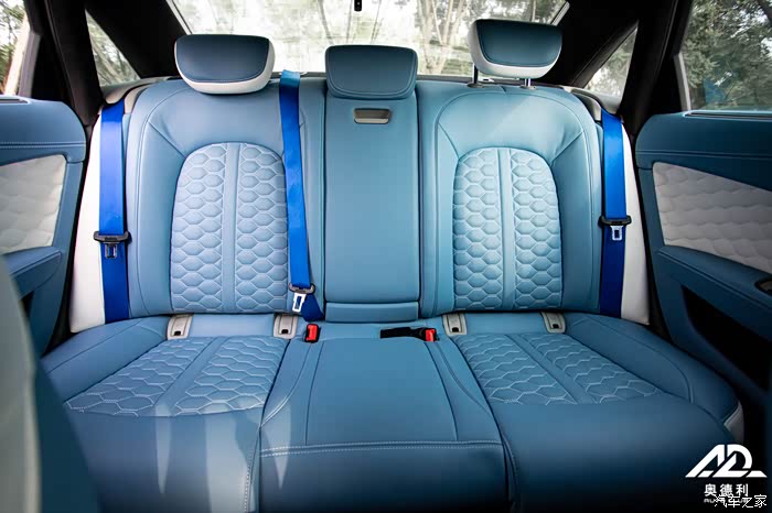 后排也保持一致性,整个车的内饰还是很有质感,蓝色安全带也很个性,车顶也是麂皮绒进行了包覆。