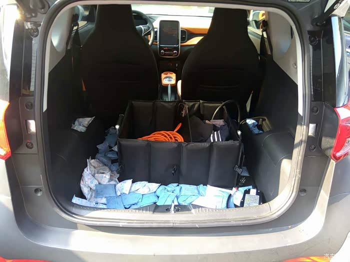 30米充电线延长线,外加一个接地宝,还有车载应急充电器、碳包等其他乱七八糟的东西,所以另外购买了一个可折叠收纳箱,选择的是没有盖的产品(有盖反而引起小偷的贼心),实用性不错,反正长时间都是一个人开,对四座没什么兴趣。