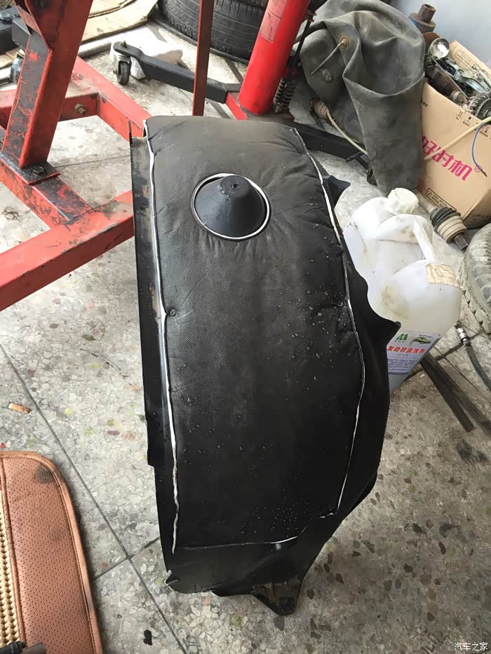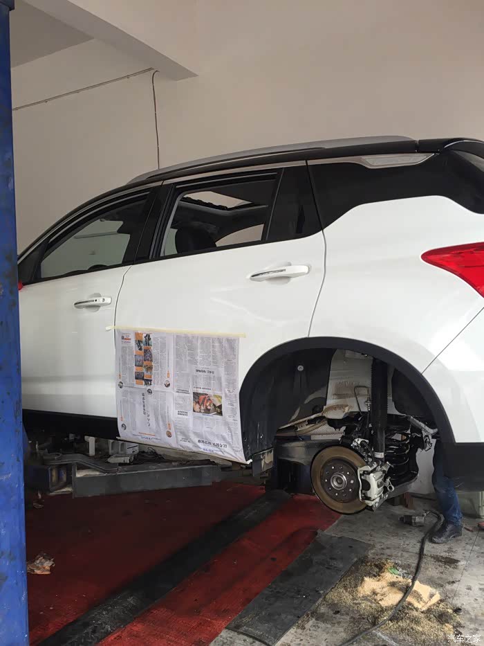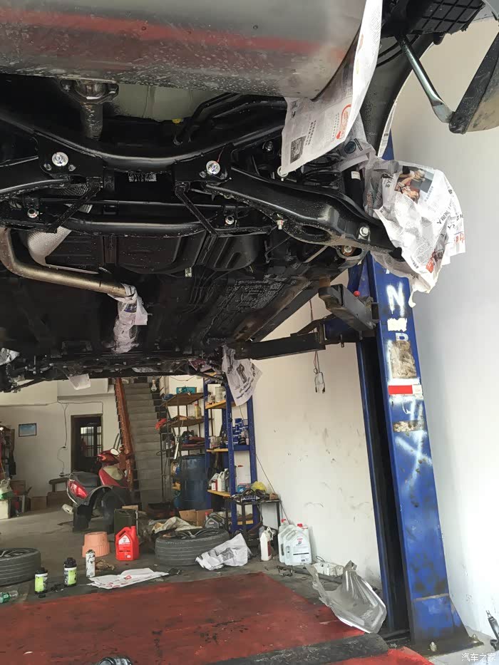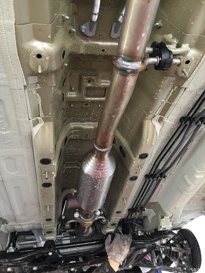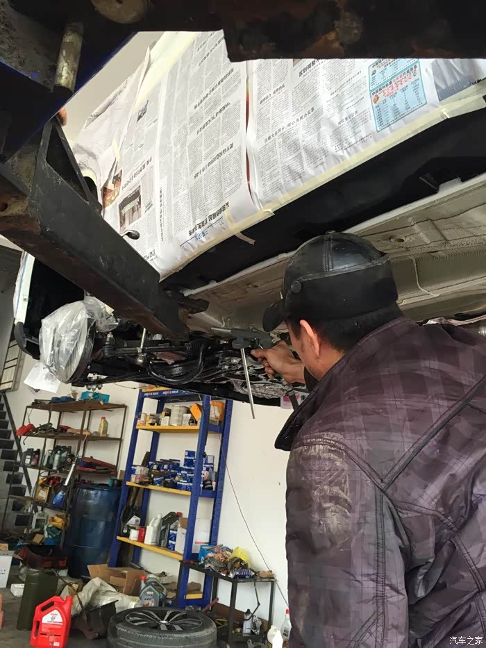 在提车的时候做底盘装甲最合适,底盘比较干净,沾染的泥土灰尘雨水较少,施工较为轻松,我做底盘装甲的时候车子已行驶700公里,风里来雨里去,底盘已经脏得一塌糊涂。好在这家店比较专业,各方面处理得比较到位,不需要自己再多去费心。如果各位亲也需要做这些,首先要把车底盘冲洗干净,用气泵把水再吹掉,然后用抹布把底盘擦拭干净,然后要舍得心痛,因为会上吊机把四轮、挡泥板、轮眉以及排气管隔热铝板拆掉。这项工作看起来就不太简单,有很多黑心修理厂会忽悠说很简单,他们只会给你们喷喷底盘,轮胎都不用拆卸,自然简单了。一整套底盘装甲做下来绝对需要大半天的!我从早上九点洗车开始,一直到下午四点试车完毕,全程耗费七个小时,可想而知,需要多少手脚了!