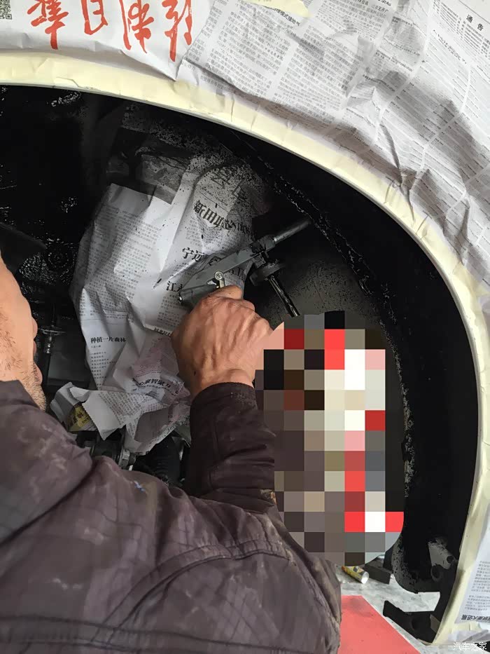 做好保护之后开喷,我用的是一个大牌子,由于是浓缩型,师傅把我的底盘装甲倒在他的瓶子里作了稀释,避免做广告,特意打上马赛克。
