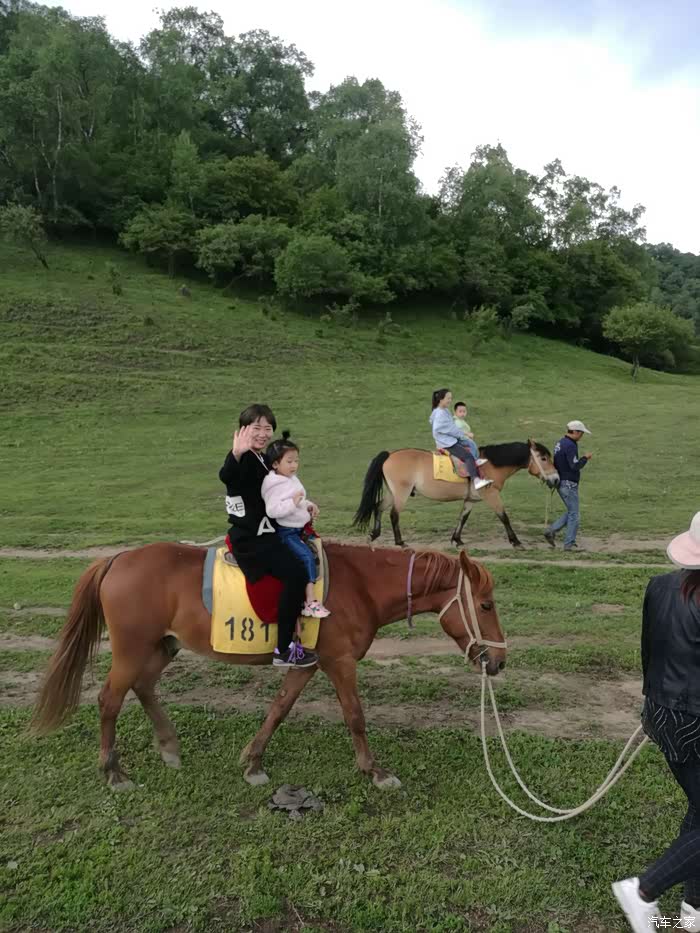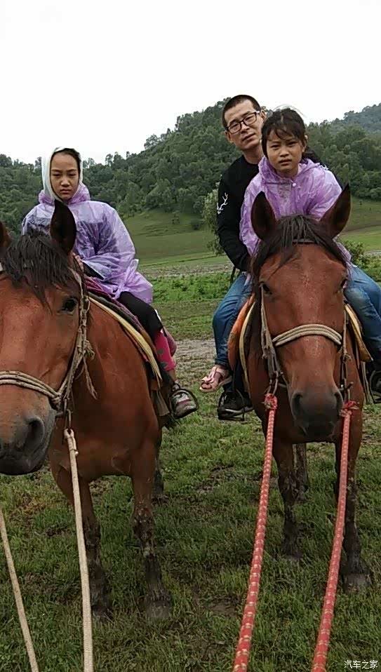 5033带着女儿骑马,天气温度低,孩子们把雨衣穿上御寒,嘿嘿,西安此时三十七八度的高温呢。
