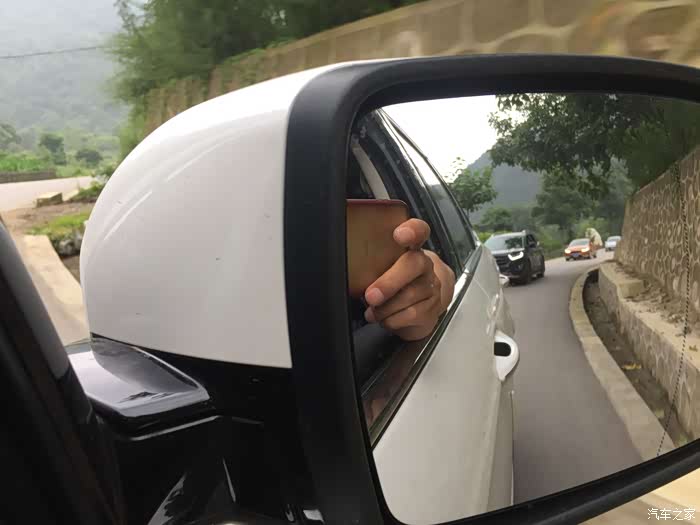 通过倒车镜给后面车拍个照,有序的车队,杠杠滴!