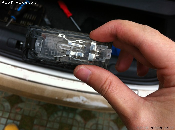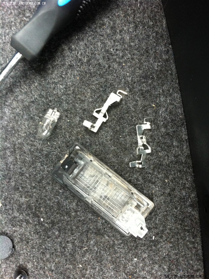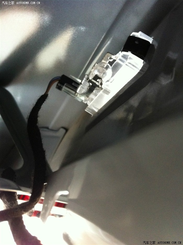 拍照灯从这个角度看右边的是卡扣,把卡扣往里面摁就可以往外松开了,然后在外面 就是车尾把卡扣那头全部松出来后在往卡扣那个方向用力掰就可以全部松出来了,上面的灯泡和导电的自己看一下怎么装再原位装回来就行了,不难。还有就是接电的线,就是上图左边黑色那里,插进去就行
