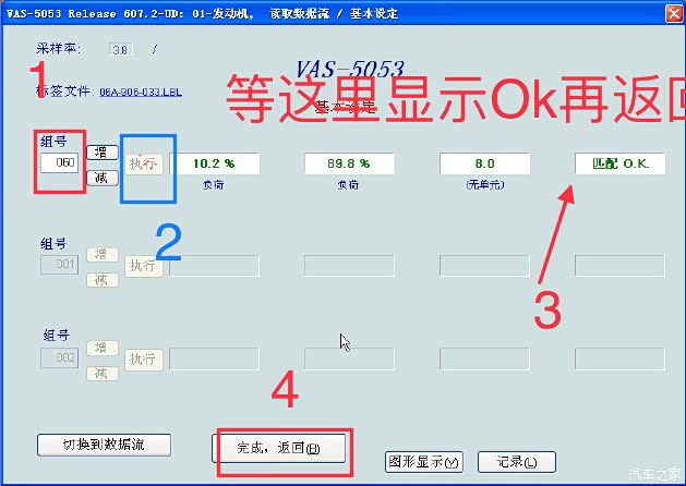 1输入“060”,2点击“执行”。3等显示“匹配O.K”后,4点击“完成,返回(B)”。