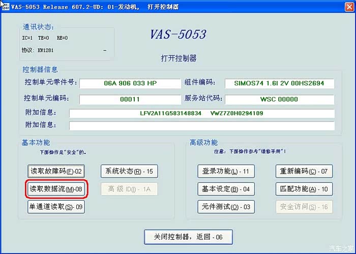 一、先把5053线连接好,然后打着车,用怠速预热水温达到90度。然后进入VCDS软件