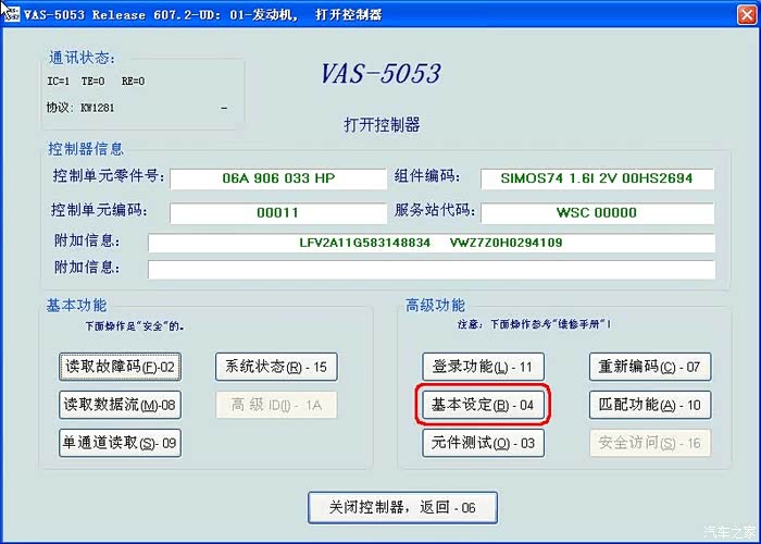 四、基本设定:此时把车熄火,然后再把车通电!通电 只是通电,不是着车(仪表盘水温90度以上,灭车状态下匹配。)