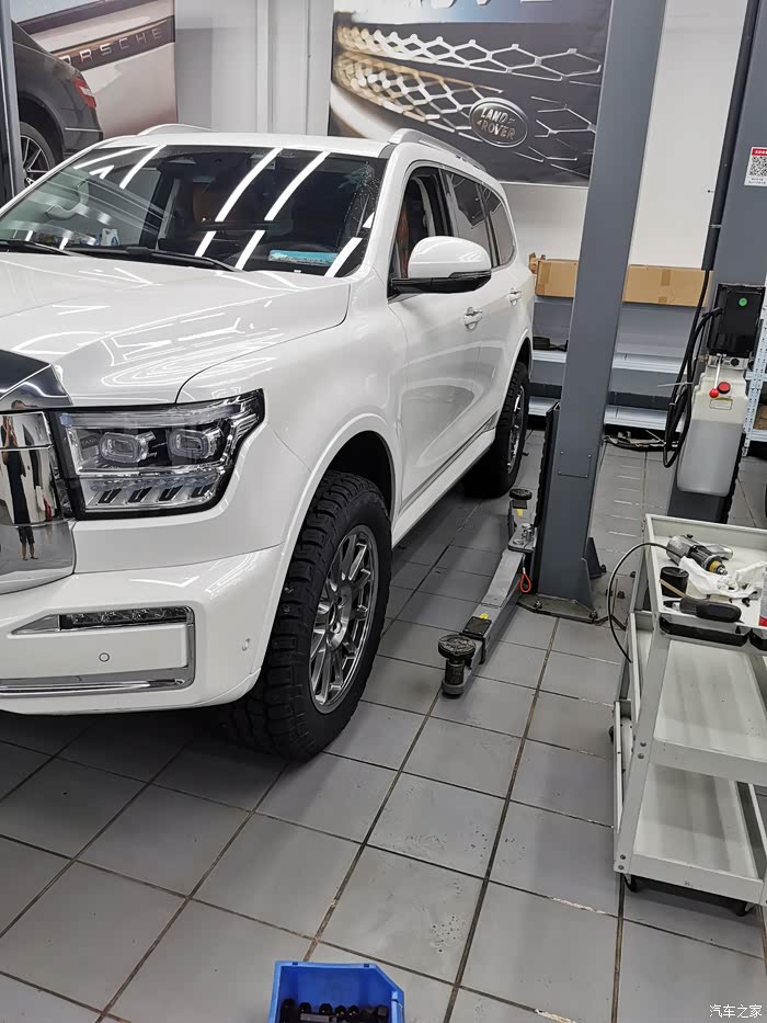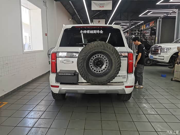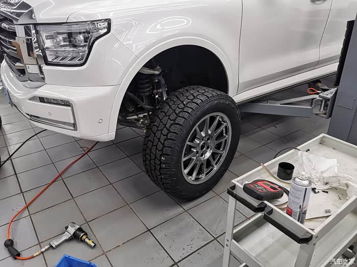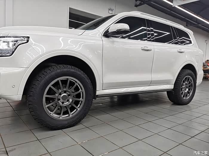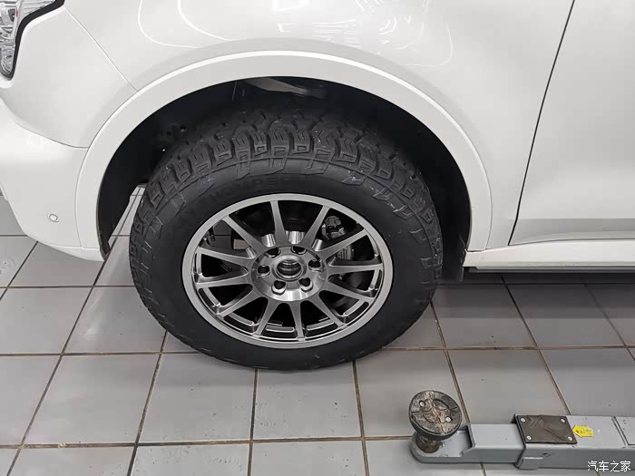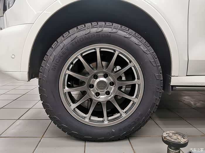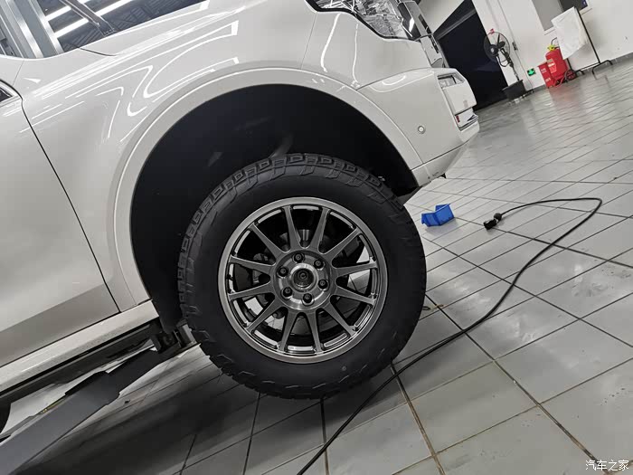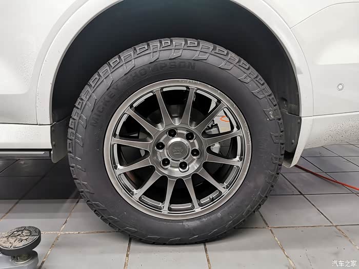 拿了气嘴感到牛师傅店里,正好遇到他的500,这个挂的是横滨的MT 265 70 17的。ET-15的锻造轮毂