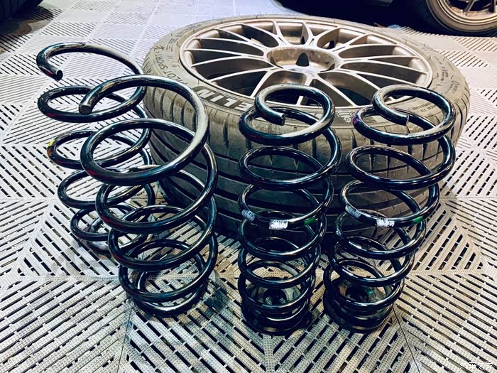 第一阶段改装结束后,在驾驶的时候感觉颠簸有点厉害,后来才知道由于轮胎离地间隙过高,导致稳定性变差,还影响视觉效果(头重脚轻),虽然我以前装了车身和底盘加强杆,但完全抑制住侧倾还是有点不足,因此第二阶段直接上短簧,选了一套艾巴赫短簧和方侧倾杆,当中顺道把米其林PS4和BLOX锻造螺丝给换上了。原本还想上一套KW避震,但想到原厂萨克斯避震用得还行,就没有再考虑。